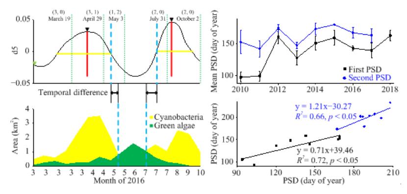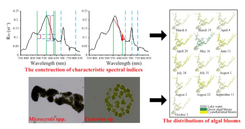 以小江(澎溪河)流域已建成的原位在線監(jiān)測系統(tǒng)為基礎,研究團隊利用環(huán)境一號衛(wèi)星CCD數據和實測地物光譜數據,首先構建葉綠素ɑ(浮游植物總生物量)與藻藍素(藍藻生物量)的反演模型,利用密度峰值聚類算法,實現藍藻水華區(qū)域自動聚類判別;其次,提出藍藻-綠藻分類光譜指數,構建兩類優(yōu)勢種水華的遙感識別模型,實現完整水文年藍藻-綠藻水華的時空信息提取;再次,利用小波峰度時序分析方法回溯近十年的遙感估測結果,從長時間尺度歸納藍藻-綠藻演替模式及潛在環(huán)境驅動因子。這一系列研究將遙感數據運用于解譯藻華時空分布格局,將有助于對三峽庫區(qū)水華暴發(fā)過程的科學認知與監(jiān)測預警。